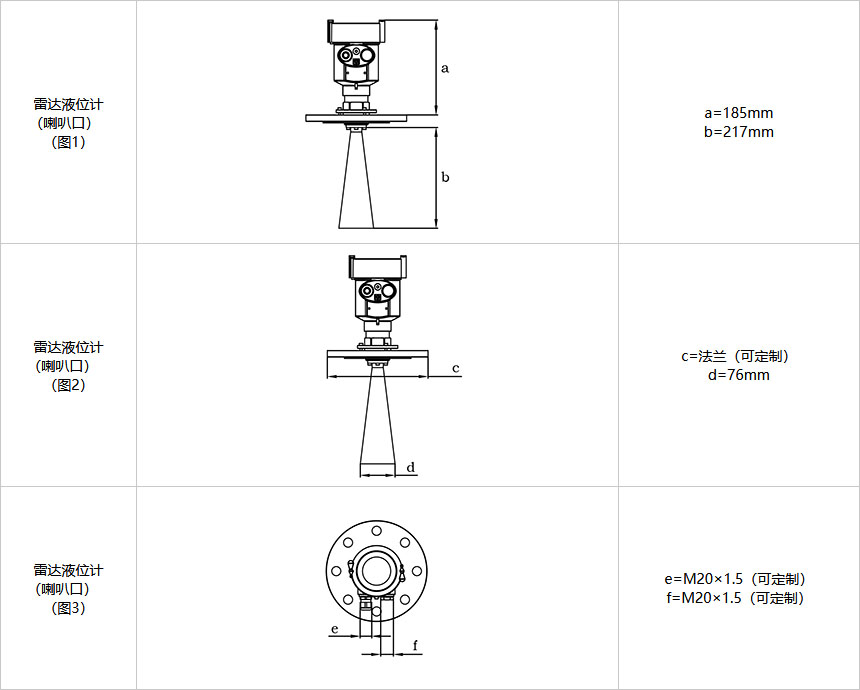 安裝要求:一般采用標準法蘭安裝到罐頂,也可采用旁通管安裝,導波管安裝等多種方式。高頻雷達放置在罐體直徑的1/4或1/6處,距罐壁不小于200mm,26G天線伸入到罐里至少10mm;測量錐形罐體,應安裝在錐形罐體平面的中間,保證可以測量到錐形頂部;測量有堆料的罐體,法蘭選型應選擇萬向法蘭(可調節方向)。